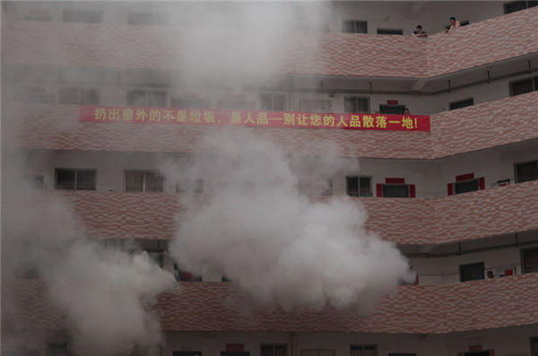14點30分,環衛公寓一號樓突然濃煙滾滾、煙霧彌漫,此時,拉響了消防疏散的警報聲。緊接著,在綠清消防逃生組的帶領下,居民們貓著腰有序地前行,穿過走廊,通過樓梯,迅速跑向操場。